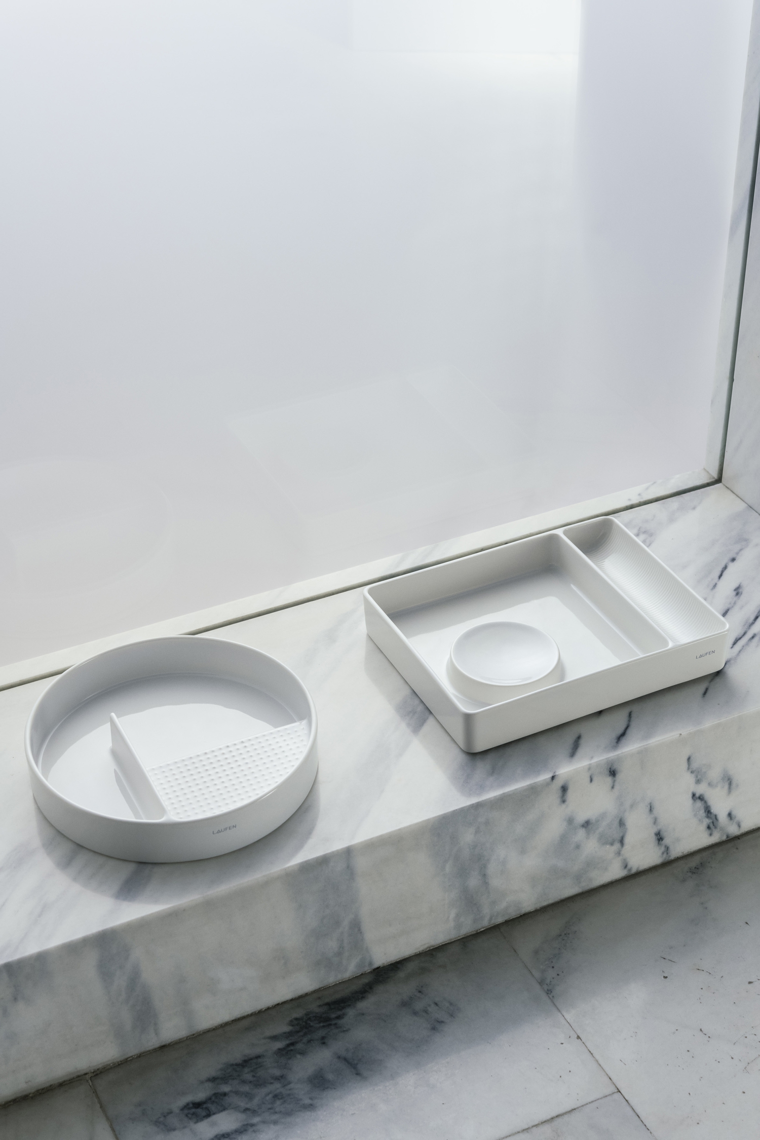 Anche la collezione VAL disegnata da Konstantin Grcic per LAUFEN presenta due vassoi, uno rettangolare e uno tondo, caratterizzati da profili sottilissimi e da una superficie interna texturizzata.