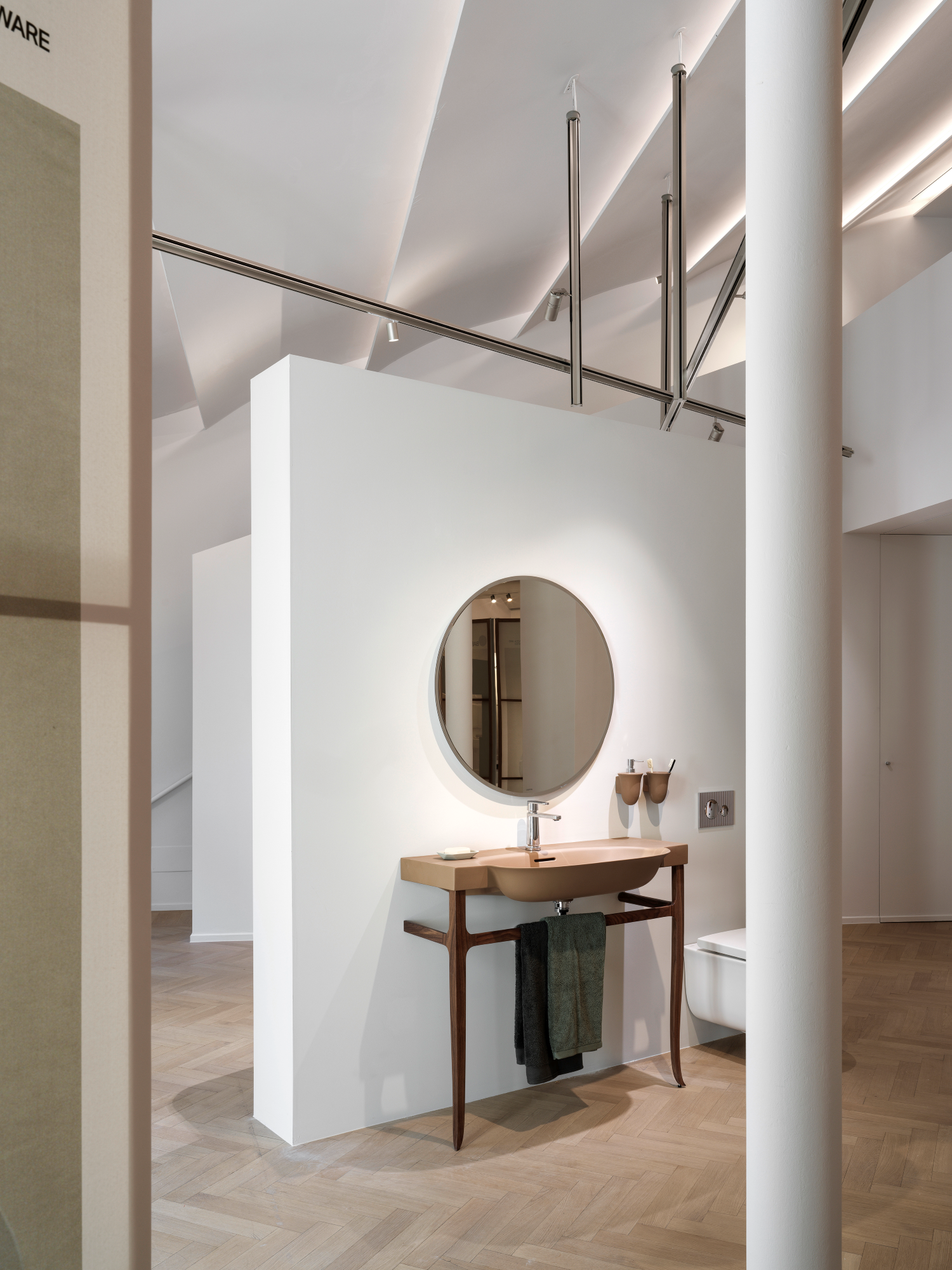 Nella seconda parte della mostra, viene presentata una serie di composizioni realizzate con alcuni pezzi iconici di LAUFEN nei colori della nuova palette, in cui i diversi colori si combinano per creare ambienti evocativi e sofisticati.