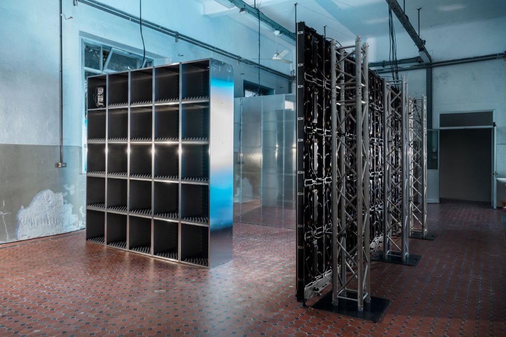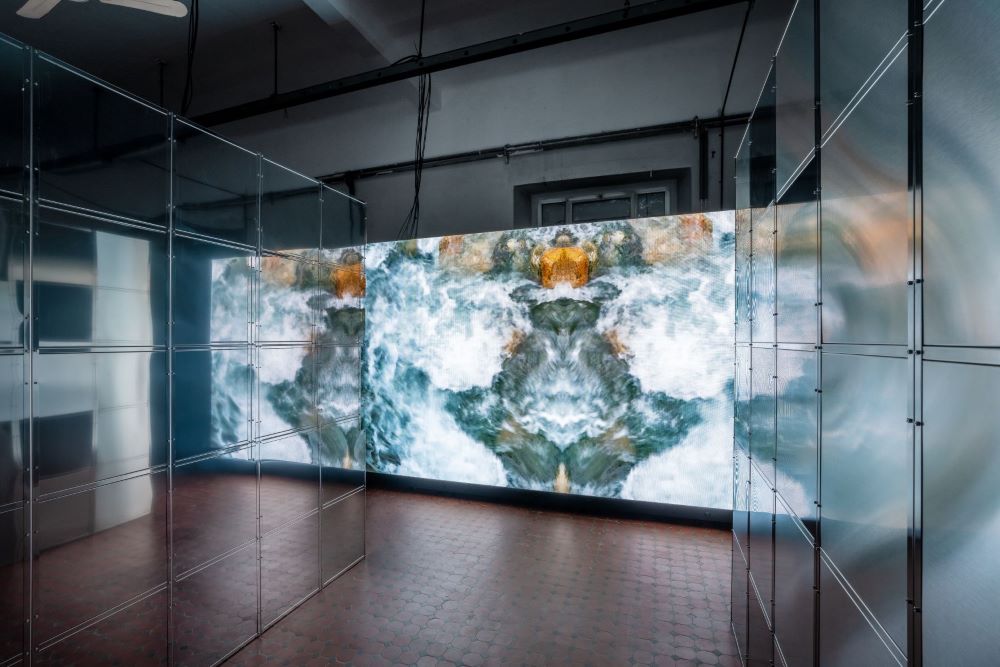 Nello spazio espositivo, NM£ X LAUFEN ha presentato due monoliti singoli in acciaio, posizionati fianco a fianco davanti a una parete a LED. Lì, una videoinstallazione è stata proiettata sugli oggetti in acciaio per creare un dialogo immaginario tra le immagini e le superfici specchiate. La video installazione è stata ideata dal regista berlinese Marc Comes. Nel video, il pubblico è stato invitato a vedere un'interpretazione del movimento, della progressione e della simbiosi attraverso clip sull'acqua mentre i pezzi della collezione LAUFEN vengono privati della loro funzione abituale e assemblati in uno spazio architettonico immaginario. È una fusione unica del mondo naturale e della sua controparte. L'intero spazio era permeato dal suono, che riverberava attraverso le grandi strutture in acciaio come un tremendo sistema audio.